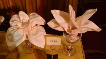 一般而言,大型宴會主賓位應選用折疊精細、造型美觀的花型,其他桌可選用一種或一類花型;如果是單桌或2~3桌的小型宴會,在同一桌上使用不同種類的花型,或用2~3種花型相間搭配,使席面折花顯得造型各異。
